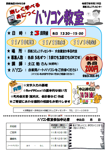 | 四絡地区同和教育研究指定事業推進委員会発行 やさしい日本語版No.2 No.3 No.4 ![]() ・四絡版 ・やさしいにほん語 ・ポルトガル語(portugal) 「わたしたちのまちよつがね」 (ご覧になりたい方はコミセンにお越しください) 「 (コミセンにあります) 希望使用日の前月1日 (土日祝日の場合は翌平日) から受付 広報配達日は毎月20日です。 (土日祝日の場合は直前平日に配達します) ・災害時指定避難所 ・地震災害時緊急避難場所 ・原子力災害時避難経由所 ・よつがねぼうさいマップ 本間恵美子さん講演会 を開催しました (2025年8月27日) 「ノーベル平和賞を受賞して」