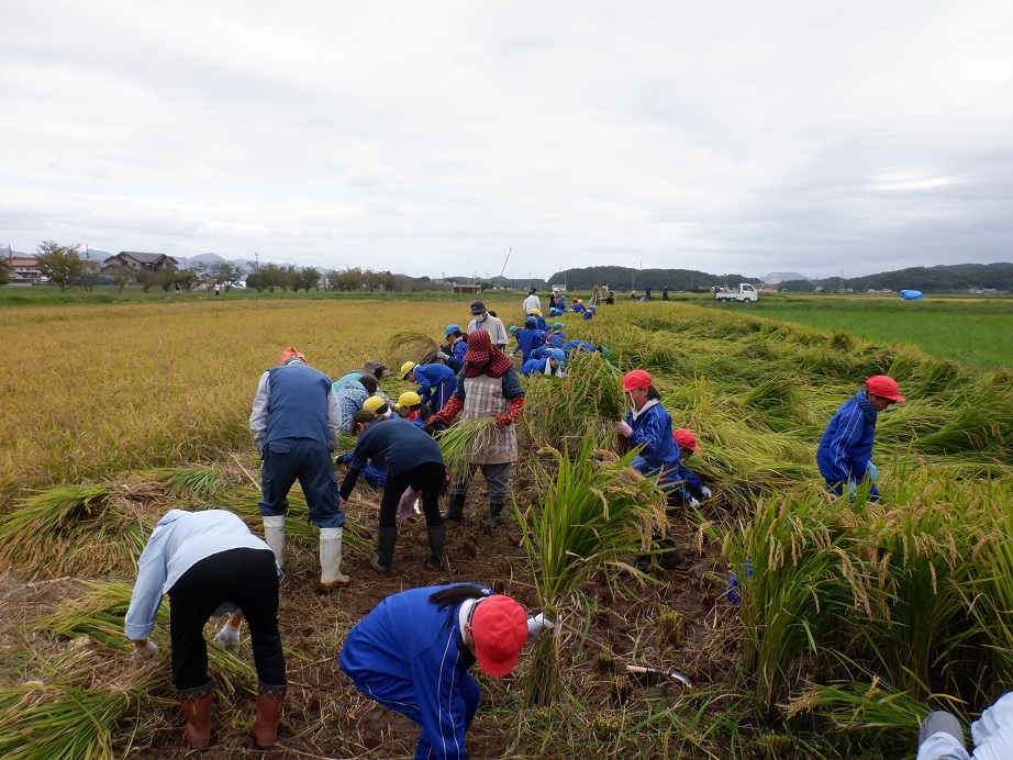 この日は6月に植えた稲の収穫を行いました。慣れない鎌を使って地域の人と協力して一生懸命に稲刈りをしていました。
