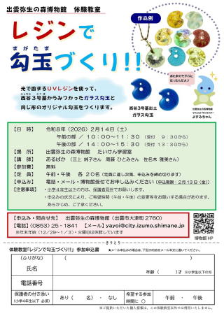 | 体験教室「レジンで勾玉づくり‼」 申込人数が定員に達したため、受付を終了しました。 |