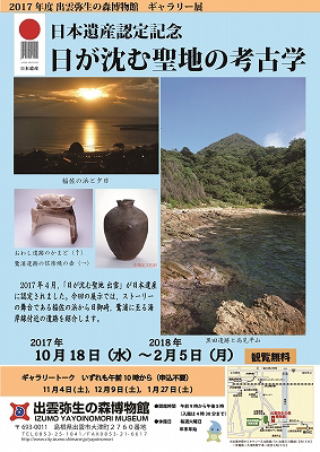 | 【展示概要】 古代からの夕日にまつわるストーリー「日が沈む聖地出雲」が、平成29年度に日本遺産の認定を受けたことを記念して、ストーリーの舞台である薗の長浜から日御碕、猪目に至る海岸線付近の遺跡にスポットを当てます。 展示する遺跡は、これまで紹介される機会が少なかった稲佐遺跡、ひろげ遺跡、高天原遺跡、黒田遺跡、おわし遺跡、鷺浦遺跡などを予定しています。出土品や写真などで、これらの遺跡の性格に迫ります。 |