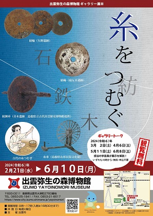 | 【展示概要】 普段私たちが使う糸は、繊維を撚(よ)り紡(つむ)いでつくられています。古代の人々も、現代と同じように短い繊維を撚ることで長い糸に加工し、その糸で布を作っていました。そして弥生時代から糸を撚るのに使われていたのが、「紡錘車(ぼうすいしゃ)」です。 |
