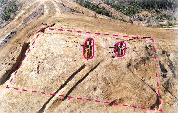 | 【展示概要】 結本谷(むすびほんだに)古墳群(出雲市斐川町直江)は、仏経山から北へのびる丘陵上に築かれた、15基以上の古墳が連なる古墳群です。このように密集して築かれた古墳群を「群集墳(ぐんしゅうふん)」と呼びます。出雲斐川インター企業団地の造設事業に伴い、2022・23(令和4・5)年に1・2号墳を調査しました。 |