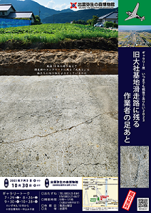 | 【展示概要】 アジア・太平洋戦争が終結してから今年で78年を迎えます。出雲市内にもこの大戦中に使用された軍事関連の施設跡や物品、当時の社会情勢を物語る痕跡や資料などが、今でも数多く残っています。中でも斐川町にある旧海軍大社基地関連施設群は、島根県内でも屈指の規模の戦争関連施設跡です。 出雲市では、令和3年度から旧大社基地滑走路の調査を断続的に行っており、その成果を展示をとおして情報発信しているところです。今回の展示では令和4年度の調査で見つかった滑走路建設作業者の「足あと」に焦点をあてて紹介します。時を超えて語りかけてくる先人からのメッセージに耳を傾け、不戦の誓いを新たにするきっかけになれば幸いです。 |