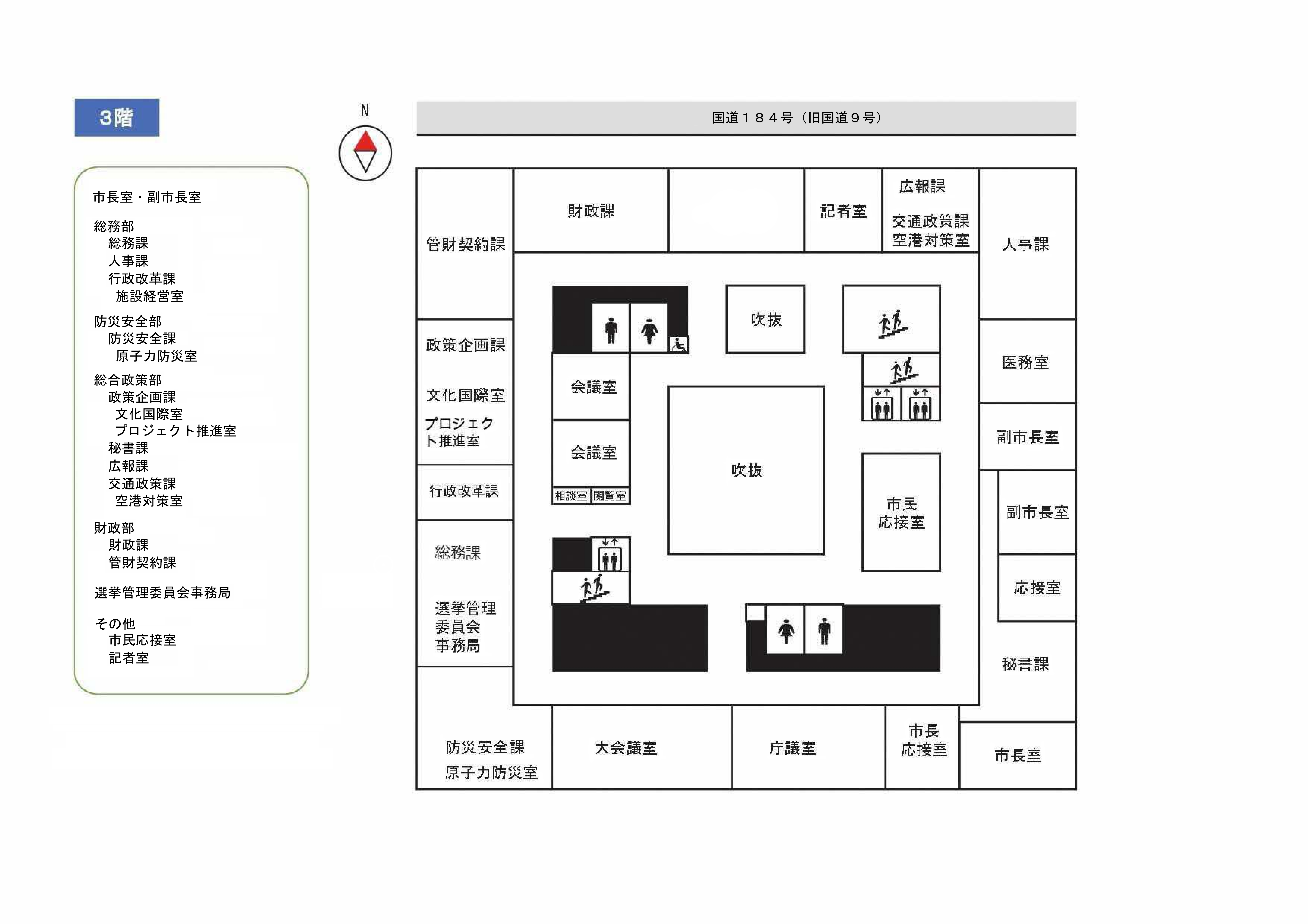 | 【総合政策部】 | 政策企画課、文化国際室、プロジェクト推進室、秘書課、広報課、交通政策課、空港対策室 | |