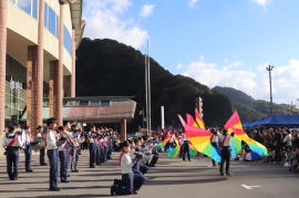 野外イベントでは、佐田中学校吹奏楽部の演奏、やまゆり職員のバンド演奏や大道芸人さっちゃんによる大道芸が行われました。最後に今年も北陵高校吹奏楽部によるマーチングが行われ、美しい音色に加え、カラーガードの華やかな動きに会場はすっかり魅了されました。 |