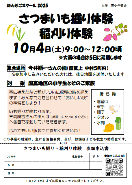 • 「さつまいも掘り・稲刈り体験」new+