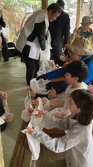 餅つき体験を開催しました。お米は昨年度のほんそごスクールの中で子どもたちが育て収穫した古代米です。6升の餅をつきました。今回は中学生のボランティアさんも手伝ってくださり、とても助かりました。地域の方々とスタッフの協力もあり、楽しく交流しながら餅つきを体験することができました。試食用に1.5升を準備しましたが、あっという間になくなりました。子どもたちが喜んで食べていて、こちらも嬉しい気持ちになりました。残りの4.5升は、29日の都武自神社の例大祭に奉納させていただく予定です。