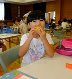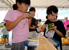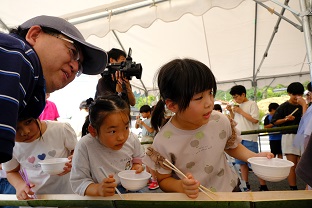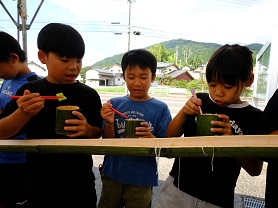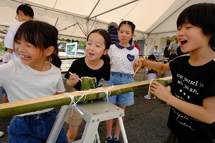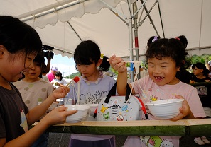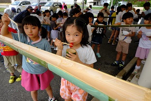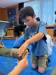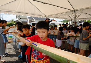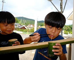 高学年を中心に、竹で器を作る作業から。中学生ボランティアさんにも手伝っていただきながら、子どもたちは上手にノコギリを使って竹を切っていました。そうめん流しが始まると、子どもたちはワーキャー言いながら一生懸命そうめんを取り、たまに流れてくるキュウリやミニトマトに大はしゃぎ。「絶対取るぞ!」と構えながら取り逃す子どもたちの可愛いこと。また、トウモロコシやスイカもいただき、かき氷も準備して、お祭りの様な賑わいでした。暑い中ではありましたが、みんなで楽しい時間を過ごすことができました。
