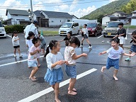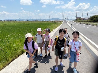 そうめん流し終了後、歩いて児童クラブへ。暑い暑いと言いながらも、用水路の生き物や鳥を観察したり、お喋りを楽しみながらのお散歩になりました。