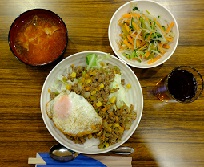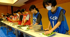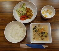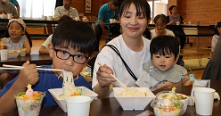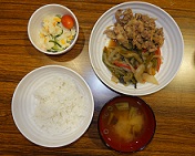 ランチは、中村サロンの皆さんが夏野菜と豚小間肉の炒め物をメインに作ってくださいました。生姜と焼肉のたれで味付けされていて白ご飯が進みました。ここでも中学生が活躍されました。