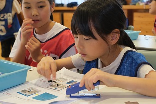 次に、村田製作所さんとオルゴール作りをしました。さすがは高学年、お友達と教えあいながら上手に作っていました。
