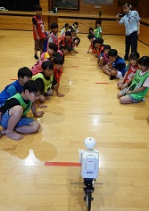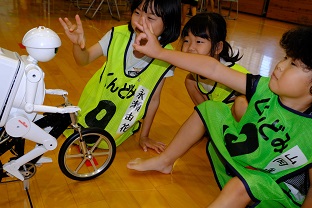 最後にムラタセイサクくんというロボットとも触れ合いました。上手くバランスをとって自転車に乗るセイサクくんに興味津々の様子でした。