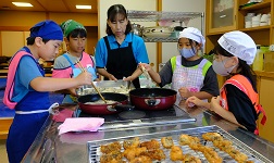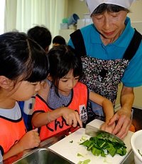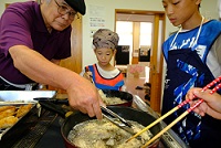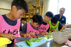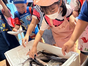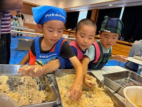 この日のランチもみんなで作りました。門脇さんに講師に来ていただき、たくさんの地域のボランティアさんにもご協力いただきました。メインはトビウオのフライ。子どもたちが一人一匹、トビウオを捌きました。最初は「気持ち悪い〜」という声も聞こえてきましたが、捌き終えると自信がついた表情で「もう一匹したい!」他にもキュウリのナムルとおにぎりも2種類作りました。