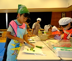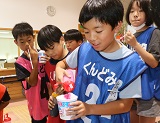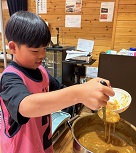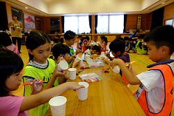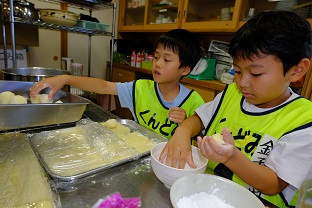 続いては、小林牧場から小林さん夫妻に来ていただき、子どもたちも一緒になってランチ作り。牛乳をたくさん使った豪華メニュー。ミルク鍋、タンドリーチキン、あべかわ団子、ヨーグルトシャーベット。子どもたちは、野菜を切ったり、団子を丸めたり、一生懸命取り組んでいました。地域のボランティアさんのおかげもあり、美味しいランチができました。