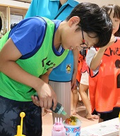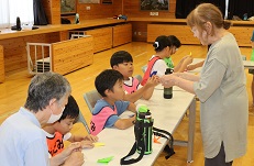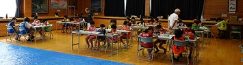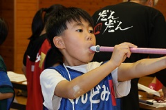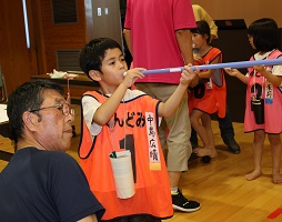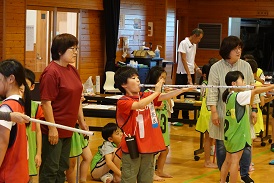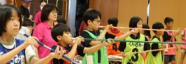 この日の最後はスポーツウエルネス吹矢。礼に始まり礼に終わる、集中力と礼儀を育てる競技です。また、最大の特徴は呼吸法にあり、様々な病気の予防や、心を整えることにも効果があります。子どもたちは真剣な表情で的をねらい、高得点を目指して頑張っていました。