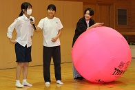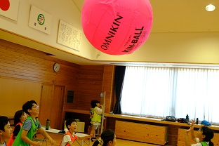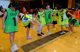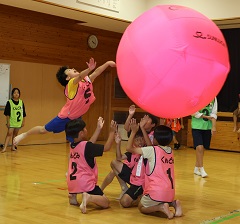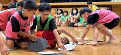 最後は中学生プレゼンツ、キンボールをしました。3チームで巨大なボールを落とさないように楽しむスポーツです。今回は5人1組6チームで対戦しました。チームワークが鍵です。