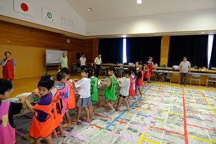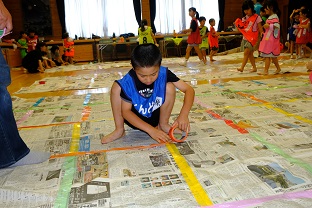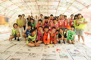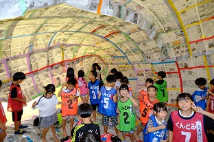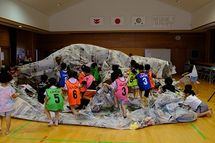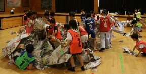 午後一番は新聞ドーム作り。みんなで協力して大集会室の床一面に新聞紙を敷き貼り合わせます。膨らむ瞬間は感動です。約2時間かけて作ったドームも、壊すのは一瞬。とにかく盛り上がりました。