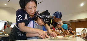 この日は平田高校の学生さんによる防災講座からスタート。地震や大雨についてクイズ形式で説明があり、防災バッグの大切さも教えてくれました。災害時に使える牛乳パックの即席スプーンを作ったり、新聞紙スリッパの作り方も学びました。