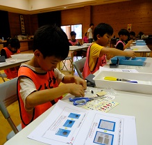 最初のカリキュラムは村田製作所さんとオルゴール作り。少し難しい部分もありましたが、大人に手伝ってもらいながら完成させました。上手くできていないと音が鳴りません。音楽が流れた時、子どもたちは「できた…!」と目を輝かせ、満足気な表情を見せてくれました。