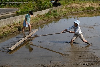 6月1日、土曜日、美談の三島勝吉さんの田んぼで、毎年恒例となった田植え体験を今年も行いました。まずはババ引きから!子どもたちも体験しました。「重いよ〜!」と言いながら一生懸命に引っ張ってくれました。その後、浜崎部長から植え方の説明を聞き、早速裸足で田んぼへ!全身泥だらけになりながら、地域の方々と一緒になって頑張りました。田植えの面白さや大変さを経験できました。