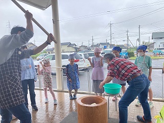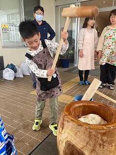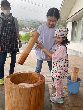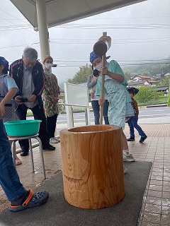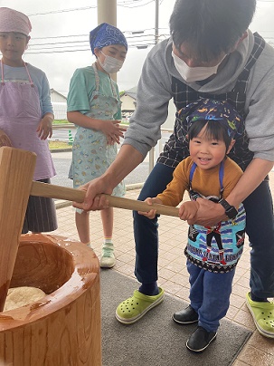 餅つき体験を開催しました。お米は昨年度のほんそごスクールの中で子どもたちが育て収穫した古代米です。6升の餅をつきました。今回は中学生のボランティアさんも手伝ってくださり、とても助かりました。地域の方々とスタッフの協力もあり、楽しく交流しながら餅つきを体験することができました。試食用に1.5升を準備しましたが、あっという間になくなりました。子どもたちが喜んで食べていて、こちらも嬉しい気持ちになりました。残りの4.5升は、29日の都武自神社の例大祭に奉納させていただく予定です。