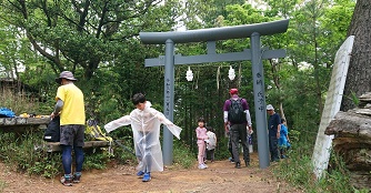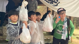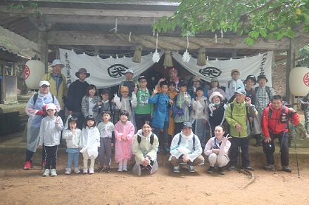 、月曜日、都武自神社の例大祭に合わせて、旅伏山に登りました。33名の参加があり、賑やかに行うことができました。雨に降られる時間もありましたが、皆がそれぞれのペースで一生懸命上がりました。21日についたお餅は参加者で分けて持って上がり、都武自神社へ奉納しました。例大祭後にたくさんのお餅が配布され、参加者は持参した袋やリュックがパンパンになるほどもらって、とても喜んでいました。全員無事に下山し、最後まで楽しく交流しながら、地域の自然と歴史を親しむことができました。