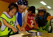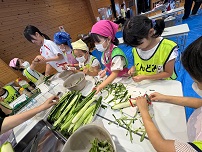 この日のランチもみんなで作りました。門脇さんに講師に来ていただき、たくさんの地域のボランティアさんにもご協力いただきました。メインはトビウオのフライ。子どもたちが一人一匹、トビウオを捌きました。最初は「気持ち悪い〜」という声も聞こえてきましたが、捌き終えると自信がついた表情で「もう一匹したい!」他にもキュウリのナムルとおにぎりも2種類作りました。