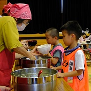続いては、小林牧場から小林さん夫妻に来ていただき、子どもたちも一緒になってランチ作り。牛乳をたくさん使った豪華メニュー。ミルク鍋、タンドリーチキン、あべかわ団子、ヨーグルトシャーベット。子どもたちは、野菜を切ったり、団子を丸めたり、一生懸命取り組んでいました。地域のボランティアさんのおかげもあり、美味しいランチができました。