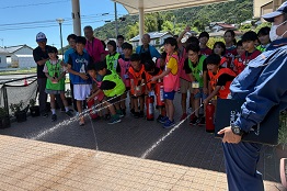 午後はニュースポーツから。梶谷さんの指導のもとモルックに挑戦。熱中してやってると、サイレンが…!「実習室が火事だー!」消防訓練です。みんな落ち着いて避難できました。消火器の使い方も教えてもらい、水消火器で実践も!