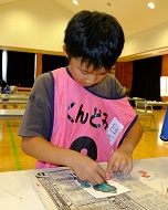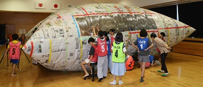 午後一番は新聞ドーム作り。みんなで協力して大集会室の床一面に新聞紙を敷き貼り合わせます。膨らむ瞬間は感動です。約2時間かけて作ったドームも、壊すのは一瞬。とにかく盛り上がりました。
