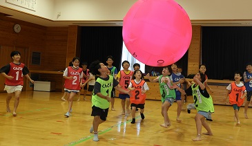 最後は中学生プレゼンツ、キンボールをしました。3チームで巨大なボールを落とさないように楽しむスポーツです。今回は5人1組6チームで対戦しました。チームワークが鍵です。