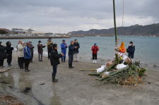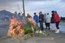 1月5日(月)、河下海水浴場にて、灘平町内のとんどさんが行われました。砂浜に立てられた竹を中心に、門松やしめ縄、祭り花などが奉納され、お清めの後火がつけられました。煙を浴びながら、今年の無病息災をみんなで祈りました。
