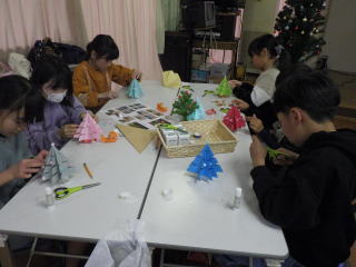 今年は工作でクリスマスツリーを作りました。ボランティアさんに教えてもら