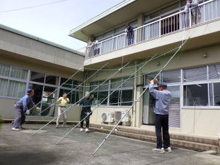 組み立てた棚を2回のベランダから引き揚げて、しっかりと結べは完成!!