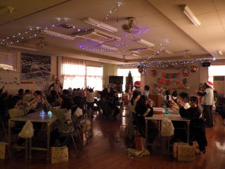 サンタさんからのプレゼントをビンゴゲームをしながら渡すなど、会場はクリ