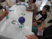 「ホバークラフト」はCDとカメラのフィルムケース、風船を使って作りました。フィルムケース上下に大小の穴をあけ、大きな穴の方に風船を取り付け、CDの真ん中に張り付けました。風船に空気を入れるとCDの下に吐き出されて浮かび、机の上を滑らかに動く様を見て、歓声が上がっていました。