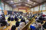 昇降口前に集合している子どもたちを前に、両地区の会長あいさつの後、児童代表からお礼のあいさつを受け、各班ごとに見守り隊と一緒に下校しました。見守り隊の皆さん今年もよろしくお願いたします。