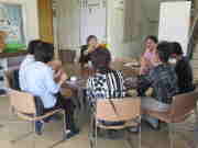6月6日、木曜日、東幼稚園の園児さんと一緒にかぶととぼたもちづくりをおこないました。ボランティアの皆さんに前日から準備をしていただき、当日は園児14名、先生方8名、スタッフ11名で、はじめにかぶとを作りました。園児のグループにスタッフ、先生も一緒に、小さな折り紙で練習した後、大きな模造紙でつくり、それぞれがシールを張って素敵なかぶとができました。