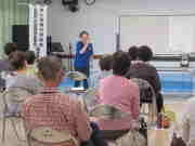 最初に、市内大塚町からお迎えした笑いヨガの青木しのぶ先生から、笑いをふんだんに交え、身体全体を使ったパワフルな笑いヨガをご指導いただきました。先生の「笑いヨガ」への熱が伝わり、参加者は年齢も忘れて活発に動き回りました。