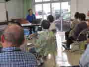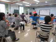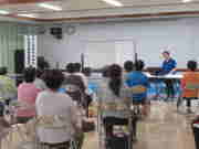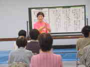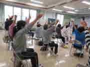 最初に、市内大塚町からお迎えした笑いヨガの青木しのぶ先生から、笑いをふんだんに交え、身体全体を使ったパワフルな笑いヨガをご指導いただきました。先生の「笑いヨガ」への熱が伝わり、参加者は年齢も忘れて活発に動き回りました。