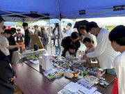 | 釣り堀ゲームは今年も人気! | 大人の出店も賑わっています | 雨の中たくさんのお客さん! |