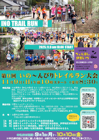 「第9回いの~んびりトレイルラン大会」が11月9日(日)に無事終了しました。ランナーの皆さま、本当にお疲れさまでした。大会結果を掲載させていただきますので、ご確認ください。 また、11月30日(日)まで今大会のアンケートを受け付けております。大会のご意見・ご感想等、お聞かせいただければ喜びます。 【2025結果_中高生一般男子】はこちら 【2025結果_中高生一般女子】はこちら 【2025結果_小学生男子】はこちら 【2025結果_小学生女子】はこちら 【アンケート】はこちら←11/30まで! |