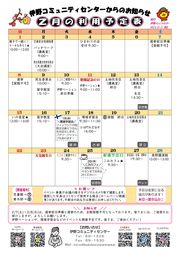 2月の行事予定を更新しました。イベントにはお申込みが必要なものもございます。詳しくは、【行事予定】をご覧ください。 主なイベント等はこちらです。(★印→要申込み!) 2/1(日) 親子で一緒に!ケーキを作ろう★ 2/11(水・祝) 伊野ベーション★ 2/15(日) いの食堂★ 2/18(水) 環境学習会 2/26(木) こみカフェ★ 2/7(土)~2/8(日)は、選挙前日準備と選挙のため、終日全館貸館不可となっております。よろしくお願いします。 【行事予定】はこちら |