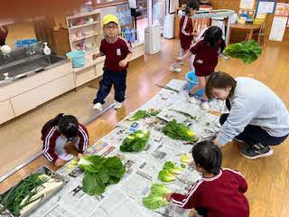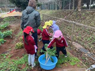 園庭から元気なかけ声がするので、行ってみると、間引いた大根を運んでいました。朝から、元気な声がすると幸せです。冷たい水で洗ってくれました。