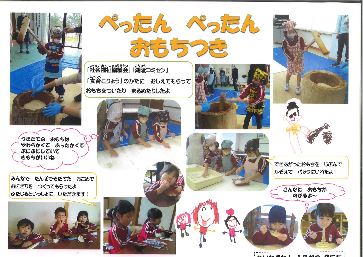 地区社協やコミセンにお世話になり、田植えや稲刈りなどの稲作体験をさせてもらっていました。今日は餅つき体験をさせてもらいました。餅つきのあとは、収穫した米でおにぎりをつくってもらって、豚汁と一緒にいただきました。ありがとうございました。そして、お餅は、幼稚園に帰ってからいただきました。つきたてでおいしかたね!