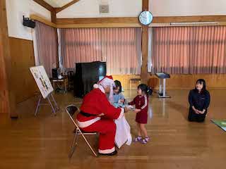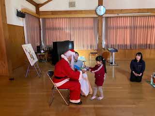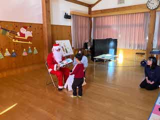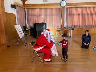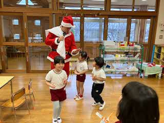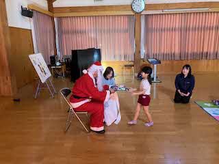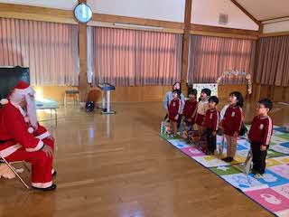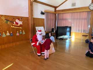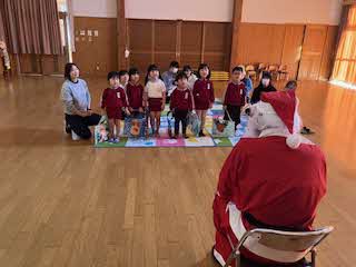 今日は待ちに待ったクリスマス会!未就園児さん4人を迎え、一緒にクリスマス会をしました。パネルシアターが終わると、鈴の音とともにサンタさんがきてくれました。園児たちからの質問に答えてもらったあと、プレゼントをもらいました!