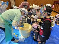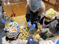 | 1月24日 味噌づくり コミセンこどもクラブ主催事業 この日は東部保育園の年中の園児さんと一緒に味噌づくり。こども倶楽部で収穫した大豆を使って共同作業です。園児さんたちが仕込んだお味噌は、1年後に年長さんになった時の給食で使用されます。2月には荘原保育園でも開催予定です。 |