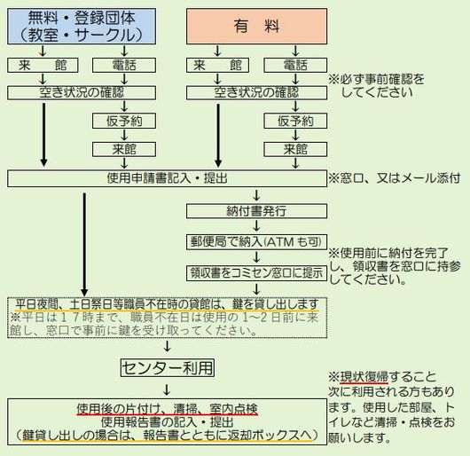 | ●センターの使用料は無料です。但し、以下の場合は使用料が必要です。 (1)出雲市外に住所を有する方の使用。 (2)市内に住所を有する者が、公共的利用以外の目的で使用するとき。 |