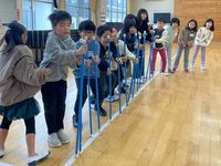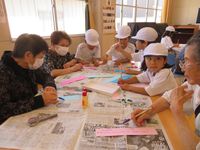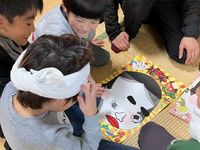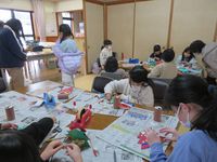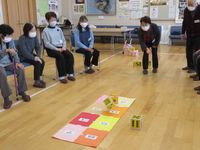 | 2月のおいでませの会は、荘原小学校1年生の皆さんと一緒に「昔の遊び」で楽しく活動しています。お手玉、あやとり、コマ回し、けん玉など、会員の皆さんやボランティアさんの技を見て、子どもたちも挑戦です。 |