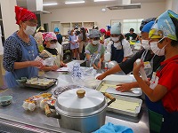 | 8月24日 夏休み子どもクッキング教室 夏休み最後の週末に集まった25人の子どもたち。メニューはうどんと豆乳ゼリー。手打ちうどんづくりは、こねて、踏んで、のばして、切ってと遊び感覚で楽しく取り組んでいました。 |